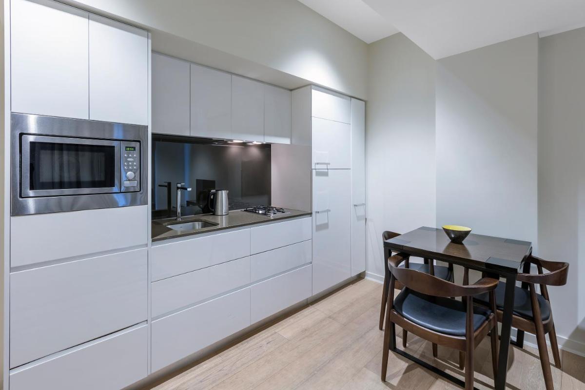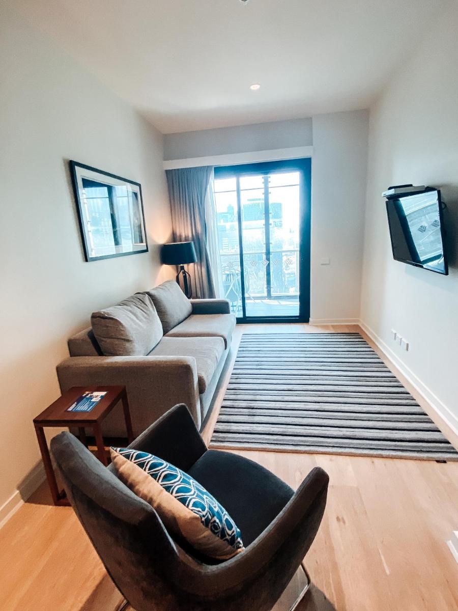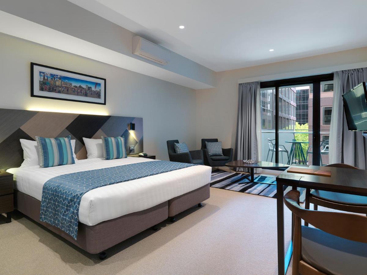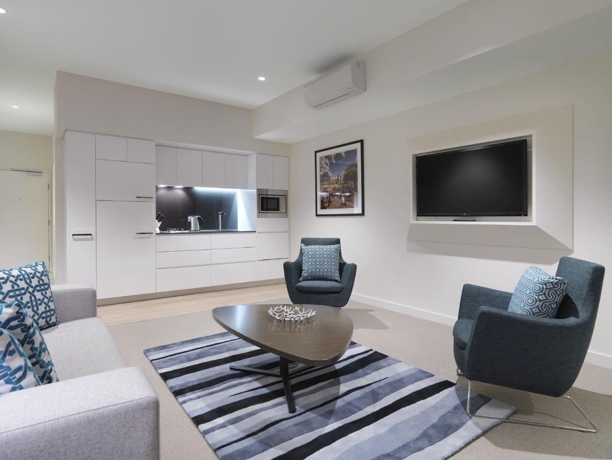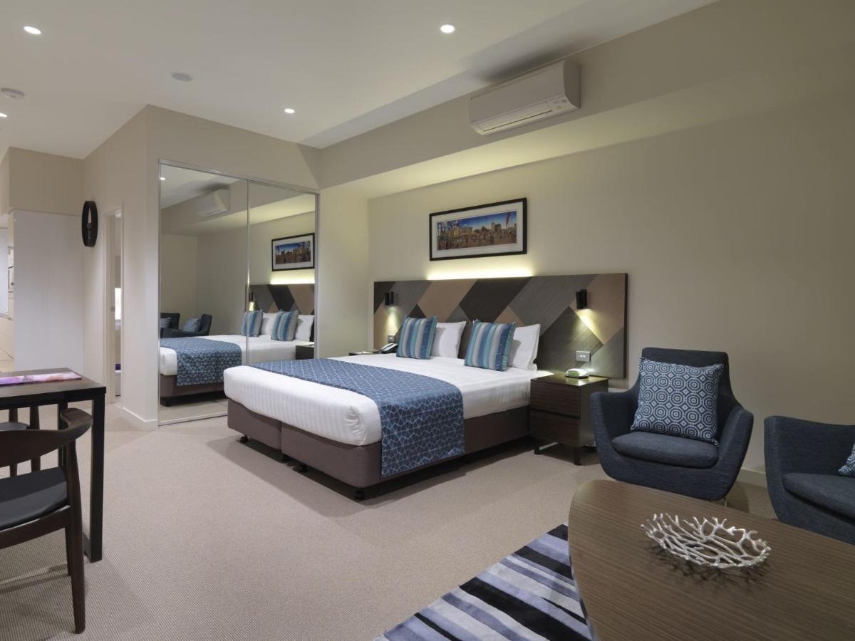 The gallery captures Wyndham Hotel Melbourne’s clean, modern style. Apartment images highlight spacious living areas, sleek kitchens with stainless steel appliances, and bright bathrooms with tiled finishes. Bedrooms appear understated, with neutral tones and floor-to-ceiling windows framing the city.