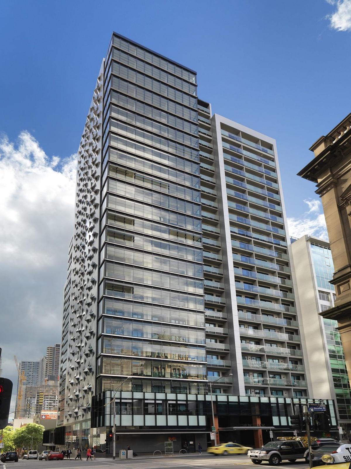 Street-level shots illustrate the hotel’s position on William Street, surrounded by tram lines and city architecture, while interior photos of the reception and lounges show polished but casual settings.