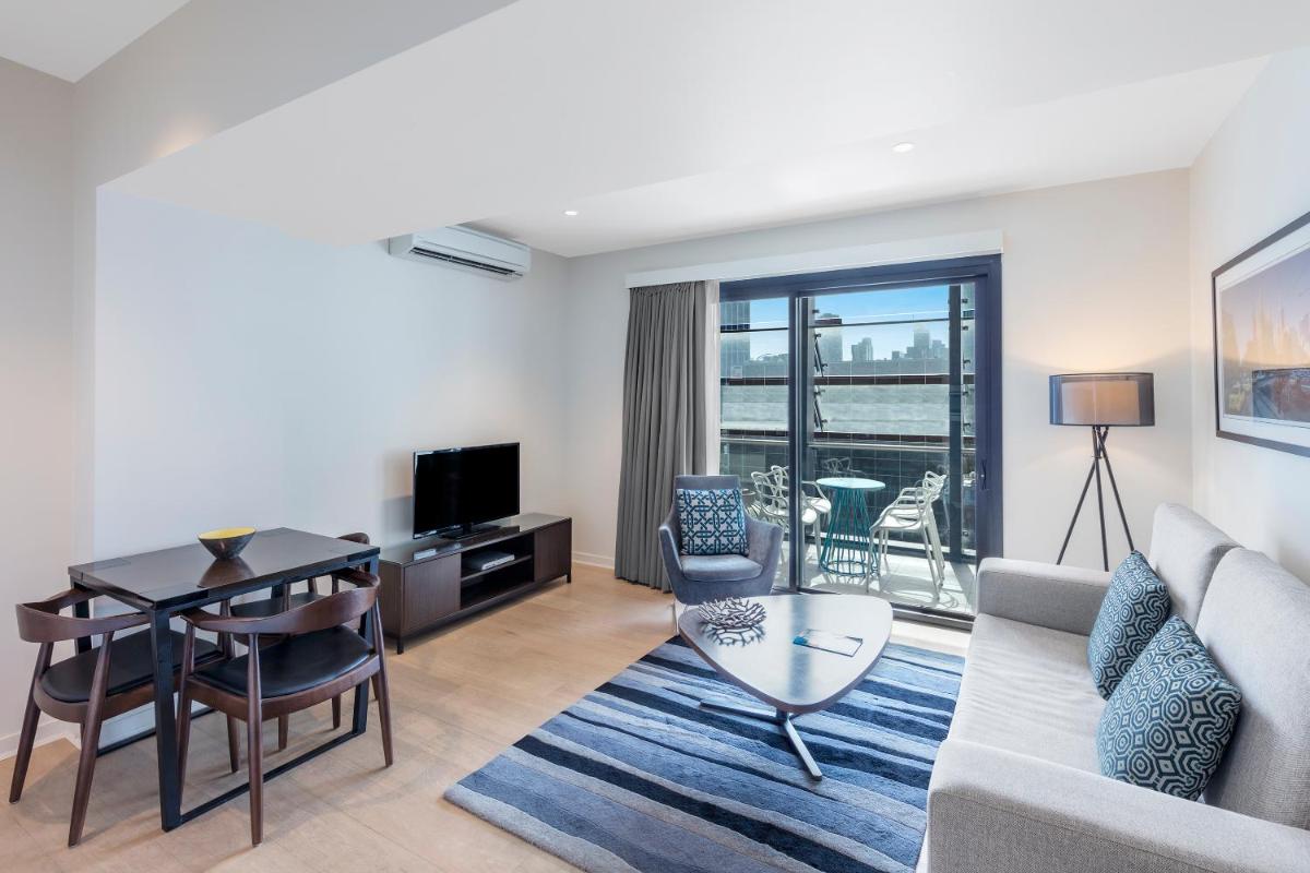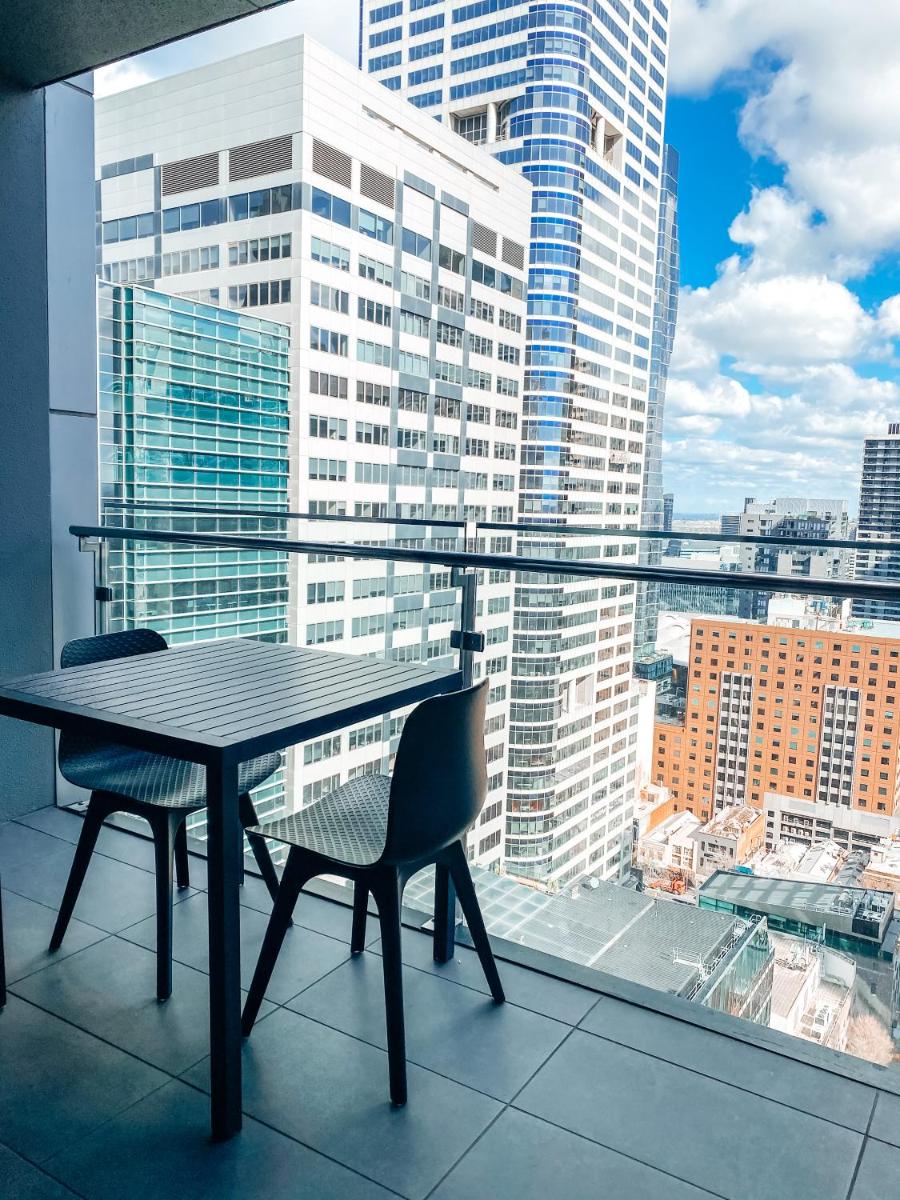 Shared spaces emphasize lifestyle. Rooftop photographs show the pool with sun loungers, BBQ facilities, and a backdrop of Melbourne’s skyline. The fitness center is equipped with cardio and weight machines, reflecting the property’s blend of leisure and practicality.